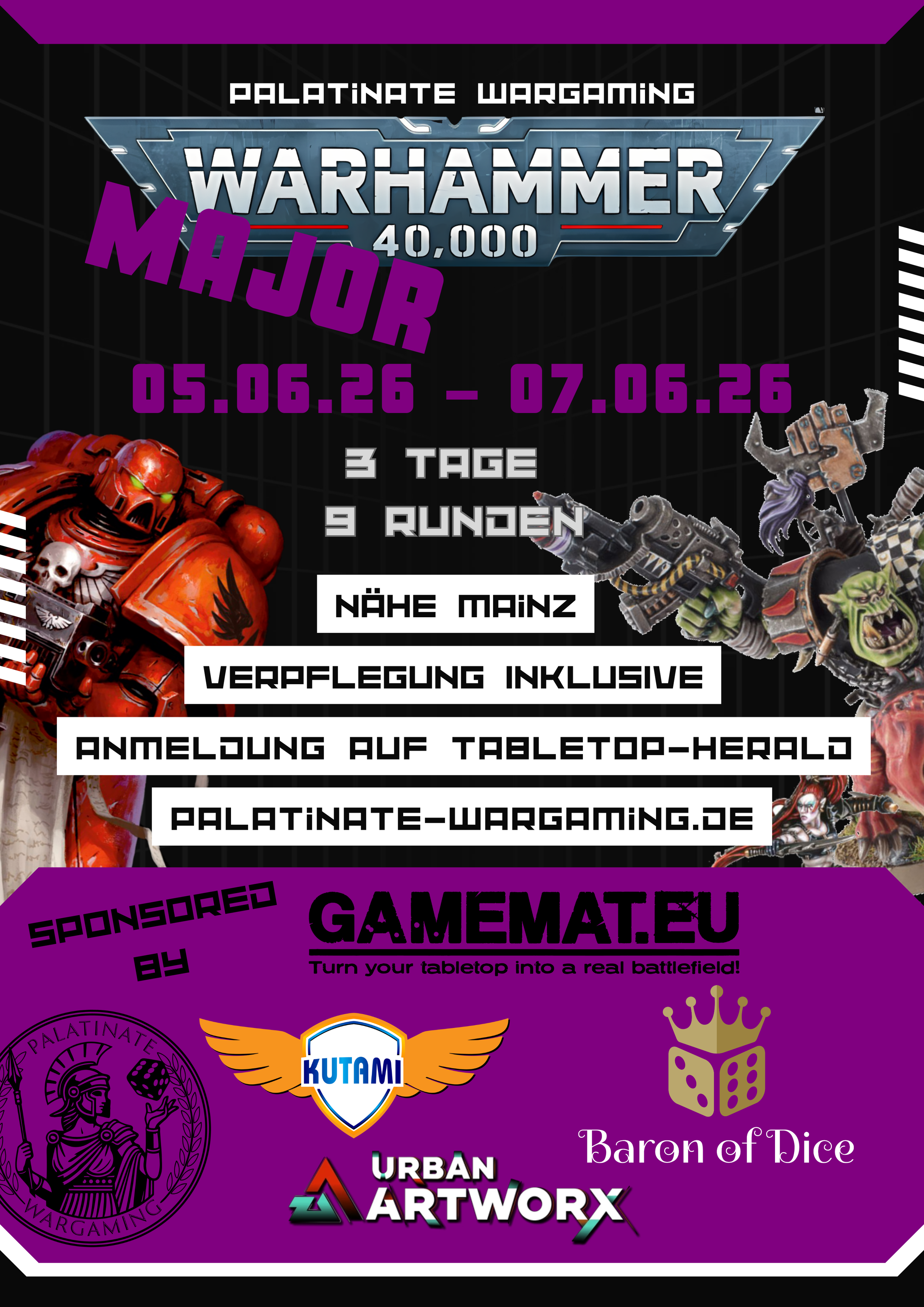 vom 05.06.26 bis zum 07.06.26 werden insgesamt 9 Runden 2000 Punkte 40k gespielt. Noch ist Platz, meldet euch für eine Teilnahme rechtzeitig an!